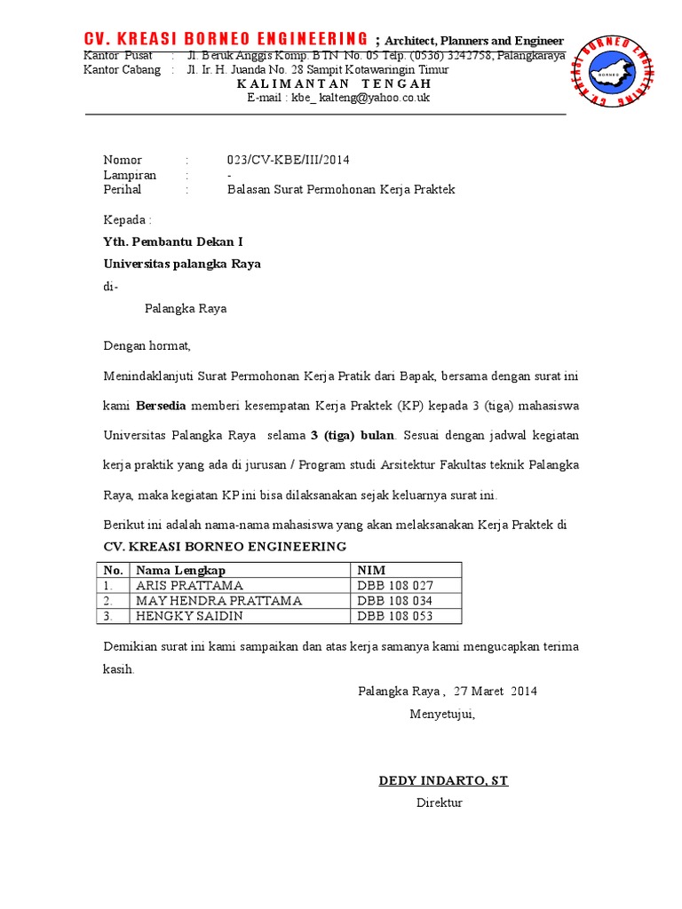 Alamat email anda tidak akan dipublikasikan. Sebagai tambahan anda dapat menyertakan berkas lainnya yang dapat menunjang karir anda, agar peluang anda di terima di suatu perusahaan lebih besar. Terhitung sejak 14 september 2012 sampai dengan 14 desember 2012 bekerja di bidan praktek swasta (bps) bidan artya di jalan poncol 1619 a rt 04. Contoh surat balasan pkl ini kami buat untuk anda semua supaya anda bisa langsung menggunakan untuk bisa. Text of surat balasan kerja praktek.doc.