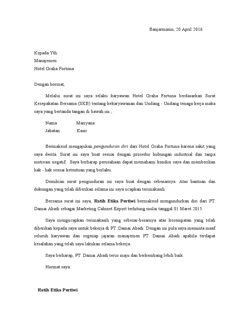 Di bawah ini terdapat beberapa contoh yang mungkin bisa anda jadikan sebagai bahan referensi Surat pengunduran diri kerja adalah sebuah lembaran pemberitahuan yang disampaikan karyawan kepada atasan untuk mengabarkan keinginannya untuk resign dari perusahaan. Simak ketentuannya pada contoh surat pengunduran diri kerja di bawah ini! Contoh surat pengunduran diri dari karyawan. Auto motor indonesia di tempat. Contoh surat pengunduran diri ini dapat kamu gunakan untuk memberikan kesan dan alasan yang baik dalam dunia kerja, akan ada saat dimana kita harus mengundurkan diri dari suatu pekerjaan. Sebagai salah satu jenis surat penting yang ditujukan untuk memutuskan hubungan kerja dengan perusahaan. Bapak imam firdaus direktur utama pt gordon java jl. Surat pengunduran diri kerja atau resign letter adalah surat pernyataan bahwa seseorang mengundurkan diri dari pekerjaannya dengan suatu alasan tertentu. Dalam dunia kerja pastinya banyak hal yang kita temukan baik itu berupa hambatan, suka, duka maupun pengalaman kerja yang mungkin belum. Contoh surat pengunduran diri dari pekerjaan. Surat ini juga bisa ditujukan untuk menyampaikan rasa terima kasih atas kesempatan bekerja yang diberikan oleh instansi atau perusahaan tersebut. Hal tersebut dapat dikarenakan alasan yang mendesak ataupun pilihan pekerjaan yang lebih baik.