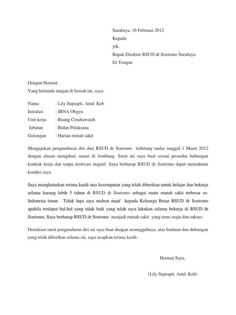 Bintang kecildengan hormat, melalui surat ini saya selaku karyawan pt. Contoh permohonan pengunduran diri kerja karyawan kontrak. Contoh surat pengunduran diri ini dapat kamu gunakan untuk memberikan kesan dan alasan yang baik dalam dunia kerja, akan ada saat dimana kita harus mengundurkan diri dari suatu pekerjaan. Di saat seperti itulah anda membutuhkan contoh surat pengunduran diri sehingga dapat membuat surat resign sebaik mungkin. Contoh surat pengunduran diri dalam bahasa inggris.contoh surat pengunduran diri atau surat resign yang sesuai dengan bidang kerjanya.