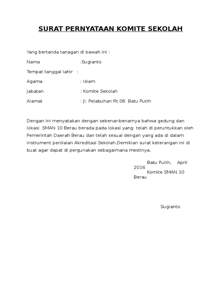 Documents similar to surat pernyataan komite sekolah. Di bawah ini merupakan sebuah contoh surat pernyataan bebas narkoba pribadi yang bisa menjadi referensi untuk anda semua. Contoh surat pernyataan adalah surat yang digunakan untuk menyatakan sesuatu kepada penerima. Ada banyak contoh surat pernyataan, yang terpenting dari sebuah surat pernyataan yakni mengenai isi dan tujuan dari isi surat tersebut. Surat ini juga memainkan peranan penting dalam sirkulasi pegawaian di tingkat dengan ini memberikan persetujuan dan tidak berkeberatan putra/i saya tersebut di atas melanjutkan studi di sekolah tinggi fisiologi malang.