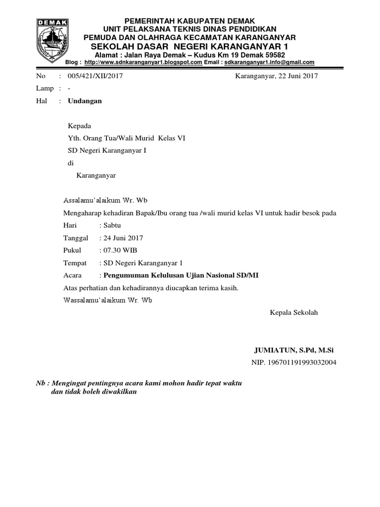 Jadwal ujian nasional yang sudah disampaikan melalui pos un yaitu tanggal 15. Contoh surat undangan resmi paling lengkap, dikemas rapi dan menarik dengan menggunakan gaya bahasa yang enak dibaca, sehingga menciptakan rasa nyaman bagi para pembaca pada saat mempelajarinya. Surat undangan merupakan surat yang dibuat dalam rangka mengajak seseorang atau pihak tertentu untuk menghadiri suatu acara. Contoh surat undangan pengumuman lulus. Biasanya pada akhir tahun pembelajaran, khususnya wali kelas atau guru kelas 6 sering ditugaskan oleh kepala sekolah untuk membuat surat keterangan kelulusan untuk pelaporan baik itu kepada orang tua. Surat undangan adalah sebuah surat yang dikeluarkan baik oleh pribadi maupun lembaga atau perusahaan yang ditujukan kepada pihak yang bersangkutan dengan isi untuk surat undangan terbagi menjadi dua macam yaitu surat undangan resmi dan surat undangan non resmi. Contoh surat keterangan kelulusan (surat pengumuman kelulusan) siswa sd (mi) tahun 2020. Semoga dapat membantu pekerjaan bapak dan ibu guru sekalian. Yang bertanda tangan di bawah ini, kepala sekolah dasar negeri sobang 2, kecamatan sobang kabupaten pandeglang propinsi banten menerangkan bahwa : Demikian postingan kali ini mengenai download contoh surat keterangan kelulusan sd. Penjelasan lengkap seputar contoh surat undangan yang baik dan benar. Contoh surat keterangan kelulusan (surat pengumuman kelulusan) siswa sd (mi) tahun 2020. Sahabat sdn sobang 1 yang berbahagia contoh surat keterangan lulus sekolah dasar (sd) tahun 2019 ini diposting sehubungan telah berakhi.